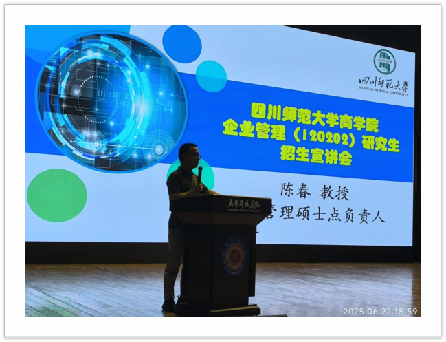 围绕专业特色,陈春教授重点解读了四川师范大学企业管理专业六大研究方向:企业战略管理、人力资源管理、市场营销、大数据管理与应用、公司财务和物流管理。依托于专业培养,近年来,学生成果令人瞩目:SCI、SSCI、CSSCI、北大核心等期刊发表多篇论文,获中国研究生企业管理创新大赛等多项国家级奖项。毕业生中,很多学生入职公务员、央企及世界500强企业,部分同学进入高校进行博士深造学习。