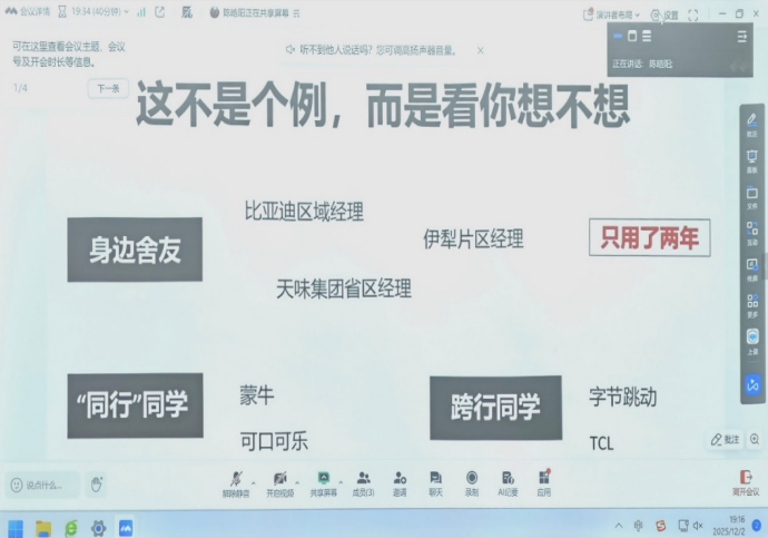尽管远在马来西亚,陈皓阳学长通过腾讯会议视频连线,与同学们分享了从校园到职场的成长经历。他结合行业趋势,为学弟学妹们提供了切实可行的能力提升建议,强调实习期间应注重专业知识积累与沟通能力锻炼。