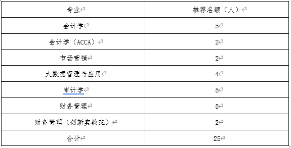 根据学校下达的25个指标(其中基础性指标14个、奖励性指标7个、支持性指标5个),依据学生基数、2026届各专业学生考研(含出国)人数、A类学科竞赛获奖人数分配基础指标和奖励性指标到各专业;支持性指标对应分配到国 家一流建设专业财务管理2个、省级一流建设专业会计学和市场营销专业各1个、财务管理+大数据创新实验班1个。分配结果如下: