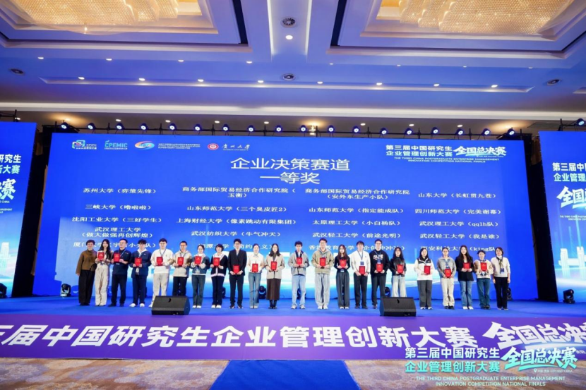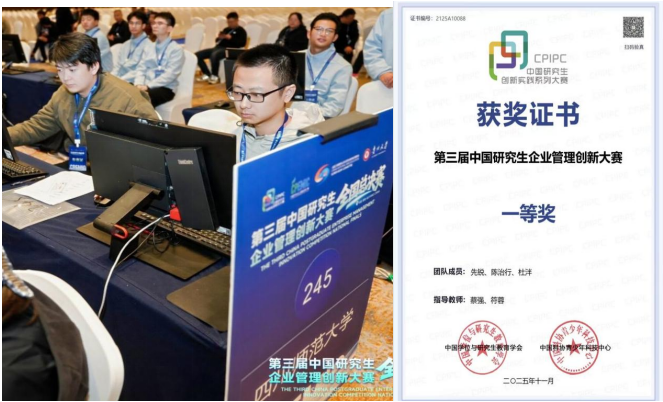 2025年11月9日,第三届中国研究生企业管理创新大赛全国总决赛在贵州大学圆满落幕。经过激烈角逐,由我校商学院研究生先锐、陈治行、杜泮组成的“完美谢幕”团队(指导老师:蔡强、符蓉),凭借其卓越的战略规划、精准的决策分析和出色的团队协作,从全国304所高校的众多精英团队中脱颖而出,斩获全国一等奖,展现了我校研究生在商业实践与创新管理领域的优秀实力。